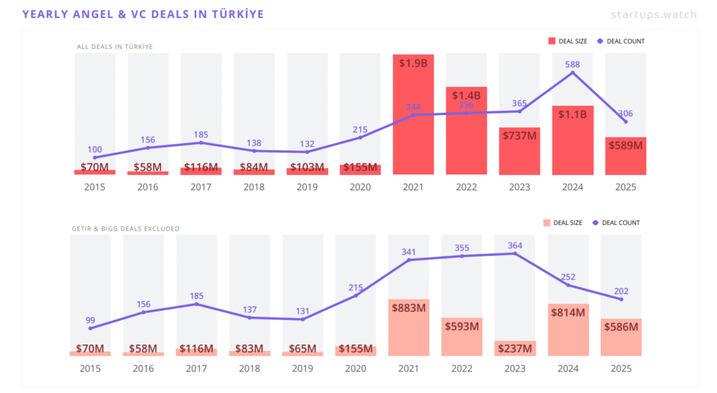 Türkiye startup ekosistemi, 2025 yılında hem yatırım tutarı hem de işlem sayısı açısından ciddi bir gerileme yaşadı. Yıl boyunca girişimlere yapılan toplam yatırım 589 milyon dolar olurken, yatırım işlemi sayısı 306’da kaldı. Bu rakamlar, bir önceki yıla kıyasla yatırım tutarında yüzde 45, işlem sayısında ise yüzde 48’lik bir düşüşe işaret ediyor. Uzmanlara göre küresel ölçekte yaşanan fonlama daralması Türkiye’yi de etkilerken, ülkedeki yapısal sorunlar düşüşü daha derin hale getirdi.