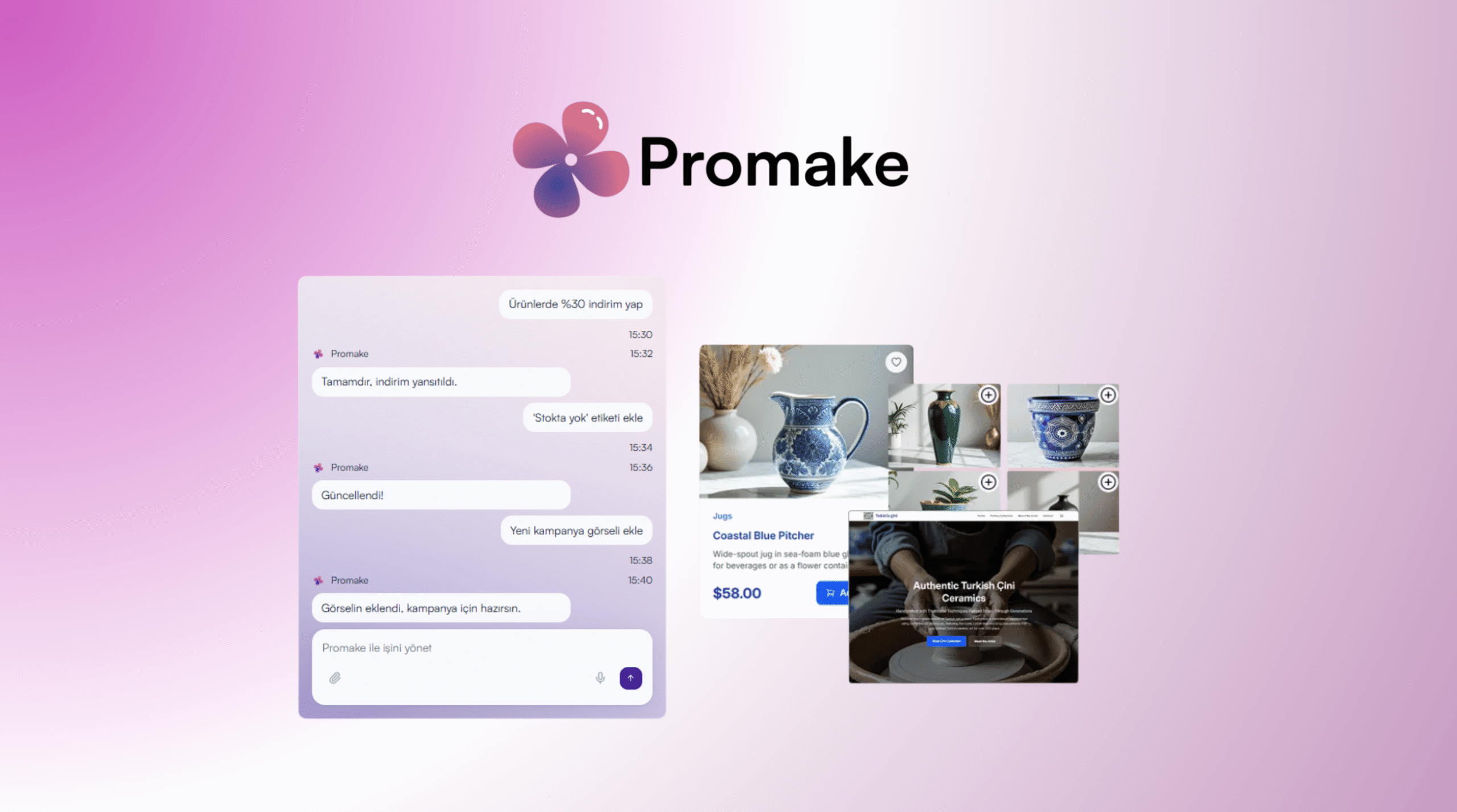 Promake, karmaşık teknik süreçleri ortadan kaldırarak iş kurma ve yönetme adımlarını tek bir sohbet arayüzüne indirgiyor. Platform; alan adı tescilinden e-ticaret altyapısına, kurumsal e-posta kurulumundan ödeme sistemlerine kadar bir işletmenin ihtiyaç duyduğu tüm dijital omurgayı, kullanıcıların doğal dilde verdiği basit komutlarla dakikalar içinde inşa edebiliyor.