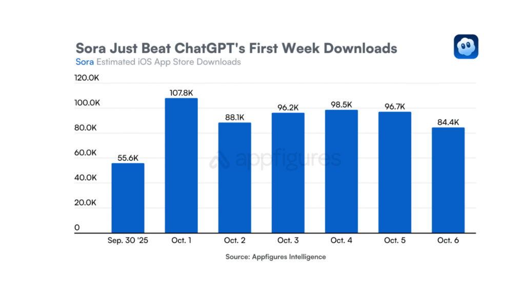 Appfigures’a göre, Sora 30 Eylül 2025’te piyasaya çıktı ve o tarihten bu yana istikrarlı bir büyüme sergiliyor. Veriler, 1 Ekim 2025’te günlük 107.800 indirme ile en yüksek seviyeye ulaştığını, sonrasında ise günlük indirmelerin 84.400 (6 Ekim) ile 98.500 (4 Ekim) arasında seyrettiğini gösteriyor.